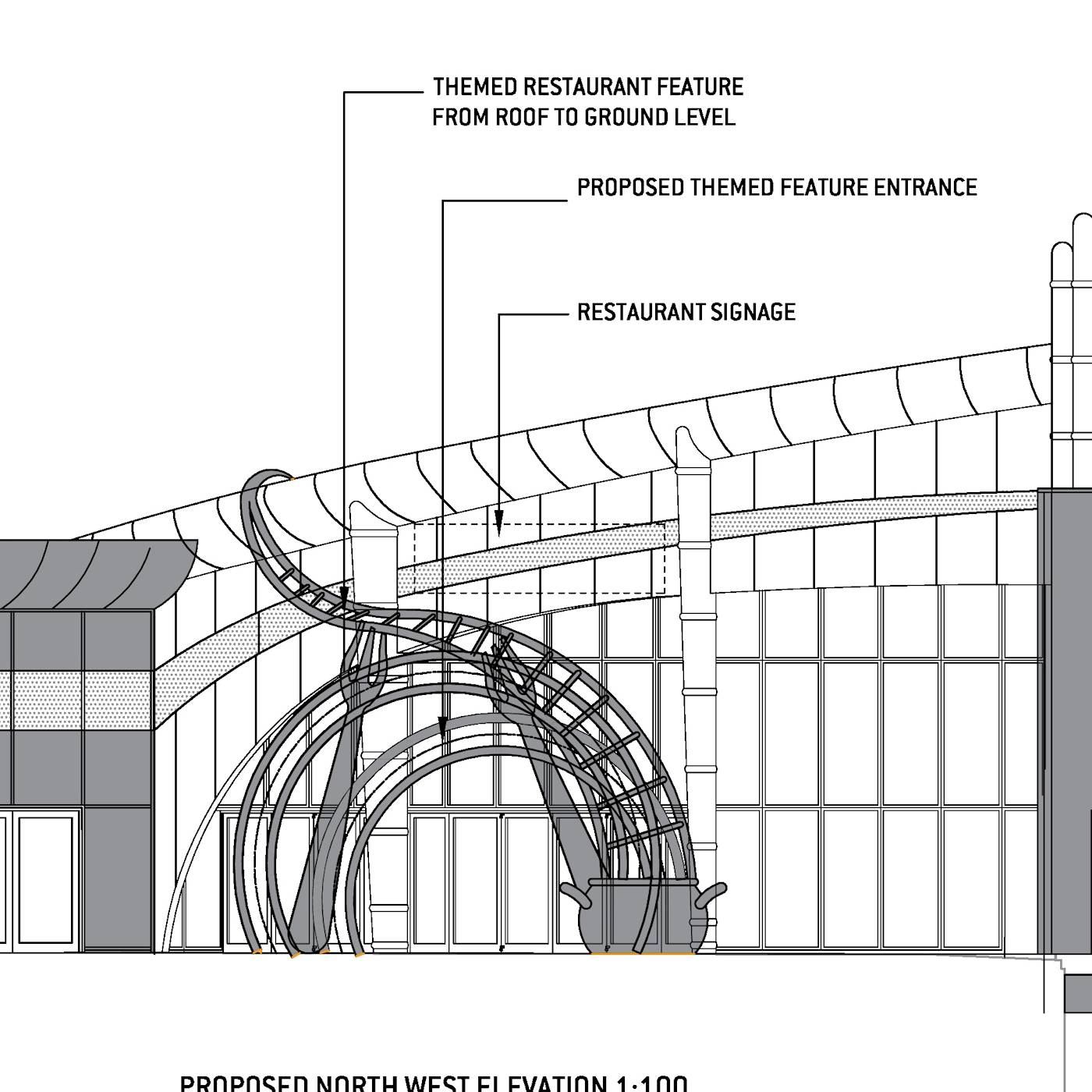 The proposals involve the extension of the existing Air Shop building to allow for conversion of the space into a new restaurant. There will be a two storey extension to the rear of the building for the kitchen and back of house areas, and a single storey extension to the front to house a new retail area. It is rumoured that the new restaurant will be a “Foodloop” style eatery, where guests order food using a touchscreen computer which is then delivered to tables by a rollercoaster rail style system (similar to that seen at Europa Park).