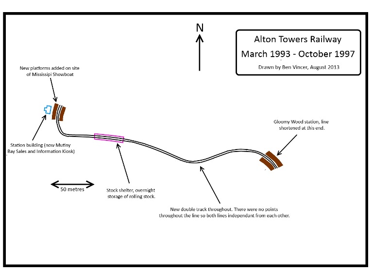 The two tracks were not linked and the lines were operated independently from each other. Ironically, the station at the Ingestre End was built on the site of the Mississippi Riverboat, which had been placed on the original track bed from pre-1981. The station at the former Chinese Temple End was rebuilt to the same specifications in a new location underneath ‘Gloomy Wood’, the new area for 1992. This layout of the railway can be seen in Figure Four.